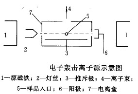 電子轟擊電離源是有機質譜儀中應用最廣泛的離子源,所有有機質譜儀幾乎都配有這種離子源,下圖圖3是電子轟擊離子源的示意圖圖。從熱燈絲發射的電子被加速通過電離盒,射向陽極(trap),此陽極用來測量電子流強度,通常所用的電子流強度為50~250μA。改變燈絲與電離盒之間的電位,可以改變電離電壓(即離子能量)。當電子能量較小(即電離電壓較小,如7~14eV)時,電離盒內產生的離子主要是分子離子。當加大電子能量(如加大到50~100eV ,常用70eV),產生的分子離子會部分發生斷裂,成為碎片離子。可用降低電子能量的方法來簡化譜圖。現有的標準EI電離譜圖都是用70eV 的電子能量得到的。