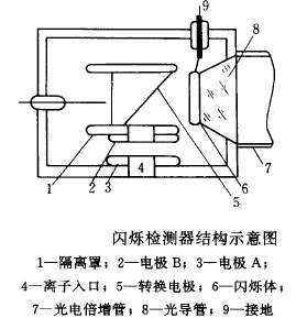 由質(zhì)量分析器出來的高速離子打擊閃爍體使其發(fā)光,然后用光電倍增器檢測閃爍體發(fā)出的光。下圖為閃爍檢測器結(jié)構(gòu)示意圖。