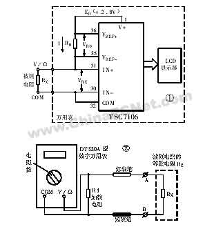 在陳述加載降壓測(cè)量法之前,要先介紹比例法測(cè)量電阻的原理。比例法測(cè)量電阻原理圖如圖1所示。圖中線框內(nèi)部分為萬(wàn)用表內(nèi)部電路。從圖中可看出,將被測(cè)電阻Rx接在萬(wàn)用表兩端,相當(dāng)于將Rx與基準(zhǔn)電阻Ro串聯(lián)后接在集成塊TSC7106的V+引腳與COM引腳之間。將萬(wàn)用表撥到電阻擋后,TSC7106的基準(zhǔn)電源Eo向Ro和Rx提供測(cè)試電流I,Ro上的壓降VRo提供測(cè)試電壓VRX,并作為集成塊TSC7106的基準(zhǔn)電壓VREF,而VRX又是輸入電壓VIN。輸入電壓VIN與基準(zhǔn)電壓的關(guān)系式為:VIN/VRO=VRX/VRO=RX/RO,由該式求得RX=RO/VRO.VRX,VRX=RX/RO.VRO。這就是比例法測(cè)量電阻的基本原理。由VRX=RX/RO.VRO不難看出,在萬(wàn)且表的同一電阻擋,若被測(cè)電阻越小,其兩端的測(cè)試電壓也越小,短路時(shí),即萬(wàn)用表顯示"000"時(shí),被測(cè)電阻RX=0,則測(cè)試電壓VRX=0;反之,隨著被測(cè)電阻RX的不斷增大,其兩端的測(cè)試電壓VRX也隨之增大。當(dāng)萬(wàn)用表顯示"1000"時(shí),即RX=RO時(shí),測(cè)試電壓VRX=VRO。當(dāng)被測(cè)電阻達(dá)到RX=2RO,即滿量程時(shí),顯示溢出符號(hào)"1",此時(shí)被測(cè)電阻兩端的測(cè)試電壓VRX=2VRO。當(dāng)被測(cè)電阻開(kāi)路時(shí),其測(cè)試電壓達(dá)到最大值約0.65V(典型值)。由于DT830A型數(shù)字萬(wàn)用表各電阻擋的開(kāi)路電壓(空載輸出電壓)約為0.65V,所以不能直接測(cè)量在線電阻,因?yàn)檫@樣高的測(cè)試電壓足以便被測(cè)電路中的硅管(在正向測(cè)量時(shí))趨于導(dǎo)通,從而影響測(cè)量經(jīng)果。根據(jù)被測(cè)電阻與測(cè)試電壓之間的變化規(guī)律不難想到:若我們?cè)跍y(cè)量在線電阻之前,先在數(shù)字萬(wàn)用表的V/Ω與COM插孔之間,即兩表筆之間,跨接一個(gè)電阻R1,也就是預(yù)先中一個(gè)負(fù)載電阻,把數(shù)字萬(wàn)且表在該電阻擋的測(cè)試電壓降下來(lái)。只要R1的阻值選得合適,就能使其最大測(cè)試電壓被限制在0.3V以下(不大于0.3V)。鑒于目前國(guó)內(nèi)外普遍使用硅管,鍺管極少見(jiàn),而硅管在0.35V電壓下仍處于截止?fàn)顟B(tài),因此可以忽略硅管對(duì)被測(cè)電路的并聯(lián)作用(可將硅管視為開(kāi)路),所以這種方法能夠用來(lái)測(cè)量晶體管在線電阻,這就是加載降壓測(cè)量法。用此方法測(cè)量在線電阻時(shí),各電阻擋的最大測(cè)試電壓距上限0.35V應(yīng)留有一定的余量,通常取最大測(cè)試電壓小于等于0.3V。)用加載降壓測(cè)量法測(cè)量在線電阻的電路連接如圖2所示。