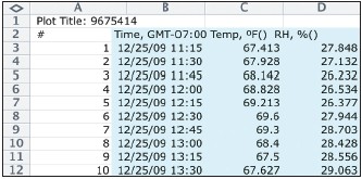Excel提供的數據顯示顯著的控制。創建一個圖的第一步是打開的。csv數據文件,并選擇時間戳記加上利息觀察數列不需要列。在下面的例子中,已選定的時間,溫度和相對濕度。