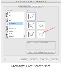 在Excel中,“線”的圖形是極其有限的,如何能代表數據。它繪制所有觀測X值,而不考慮順序。這使得無法縮放圖形,選擇有限的部分,或情節額外的數據用不同的數據收集頻率或啟動時間。 “XY散點圖”圖是一個更好的選擇。