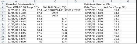 擴大每小時使每15分鐘觀察,有一個相應的氣象觀測數據,最簡單的方法是使用VLOOKUP函數。這是一個時間戳相匹配的一列與另一列中的時間戳,并帶回相關信息的數據庫功能。該函數的形式為VLOOKUP(查找值,查找陣列,列類型)。在下面的例子中,使用VLOOKUP函數每小時的天氣數據,以配合15分鐘的溫度觀測。