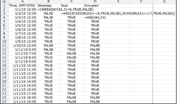 例如,要區分自用和空置期間的觀察,添加列,確定是否在本周的天是周末或周日和建筑物是否被占用小時的基礎上。在下面的例子,建筑占用周一從8點到下午5點至周五。 “平日”列測試來看看,如果這一天是星期一至星期五,“一小時”一欄測試看看小時,上午八時和5時,“占領”一欄相結合的邏輯的結果,以確定如果發生相應的觀察,星期一至星期五上午8點和5點之間。