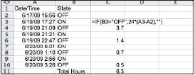 由于我們通常是在“上”的時間,計算前“的狀態和當前的”關閉“狀態之間的時間間隔。在下面的例子,在C列測試細胞的狀態是否是“上”或“關閉”。如果目前的狀態是關閉的,時間間隔僅僅是“關”的時間減去“上”的時間。乘以24小時,然后再總額回報的結果差異。在最后一個欄位的雙引號告訴IF語句返回一個空值,值相加時,它們將被忽略。