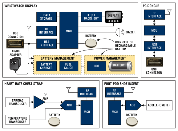 熱像儀健身監視器的所有個人元素,除了電腦加密狗,戴由用戶和采用電池供電。因此,小尺寸和低功耗是關鍵的設計參數。心率的胸帶和腳莢鞋墊通常由一個主幣形電池供電。手表顯示可以通過主投幣式電池或充電電池,這是通過一個AC適配器或USB電纜充電供電。用于手表顯示一個簡單的一個可選的背光段LCD。