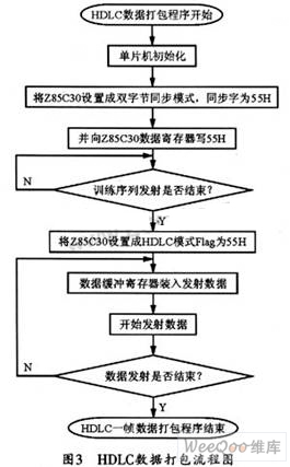 Z85C30有兩個通道,每個通道可以發送,也可以接收數據。由于數據的拆包只是數據打包的逆過程,并且Z85C30也支持HDLC幀數據的拆包,所以,在此只介紹如何進行數據打包。將打包的數據發給GMSK調制解調器,就可以得到很好的GMSK信號,這樣,GMSK信號就可以由高頻板調制發射出去,以便和其他臺站實現通信。本系統的軟件流程如圖3所示。