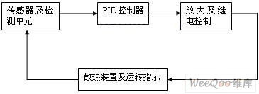 該控制系統的監測單元的核心部件為Pt100型熱電阻溫度傳感器,核心控制部件為PID智能控制調節器,控制系統的執行元件為液壓系統的散熱裝置。控制框圖(圖2)如下: