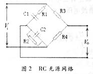 采用文氏電橋的RC無源網絡見圖2。該網絡具有選頻特性,取R1=R2=RT(鉑熱電阻),其自然頻率ωn為溫度T℃的函數,顯然,溫度T和自然頻率ωn呈一一對應的關系。取Fn=ωn/2π,表1描述了溫度T和頻率Fn對應的關系(部分數據)。而T與V′I和V′o的大小無關。在整個網絡的信息傳遞中,ωn是我們需要的信息,而V′i和V′o只是信息的載體。