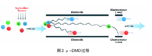 微分遷移檢測器與μ-TCD出口串聯(lián),色譜分析物直接進入其中并被離子化。分析離子隨載氣通過檢測器時,一個具有脈動場強的高頻電場被施加,使離子作橫向運動,如圖2所示。運動的幅度和橫向?qū)ΨQ度取決于每個離子的遷移特性。如果在可變場強下的強制橫向運動不對稱,這些離子將向傳輸管的一邊或者另一邊移動一定的增幅,然后發(fā)生碰撞并且被中和。只有在調(diào)節(jié)好的檢測器中具有不同遷移速率的正離子或者負離子能夠通過傳輸管而不發(fā)生碰撞,轉(zhuǎn)移電荷可以被與之相聯(lián)的靜電計檢測。由于μ -TCD記錄了樣品的所有組成信息,雙重檢測機理可以同時測定樣品中含量較大的組分和痕量組分。此外微分遷移檢測器具有耐用和穩(wěn)定性好的特性,也具有高選擇性和高的檢測靈敏度。檢測效果不隨混合樣品中分析物濃度的差異而變化。再者,微分遷移檢測器是一個“被動器件”,沒有可移動的或容易磨損的部件,因而確保其具有長的無故障操作壽命。