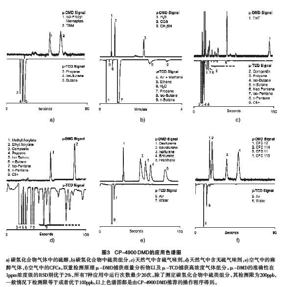 僅僅只配備μ -TCD的氣相色譜儀的分離選擇性不能夠達到分析的要求,并且沒有足夠的動態(tài)檢測范圍來分析和檢測碳氫化合物樣品中的痕量硫化物。使用硫磷檢測器或化學(xué)發(fā)光檢測器的方法,在改變痕量分析物和基質(zhì)氣體之間的比例時都會引起方法的穩(wěn)定性降低和/或發(fā)光淬滅,這種情況下不采用連續(xù)調(diào)節(jié)器就不能夠得到正確檢測結(jié)果。μ -TCD 相反,CP-4900 中的微分遷移檢測器能夠在高濃度的碳氫化合物基質(zhì)中對痕量目標(biāo)硫化合物進行快速的檢測和定量(循環(huán)時間<90s)。由于每個檢測器都具有很高的檢測靈敏度和選擇性,適合于痕量(μ -DMD)分析和ppm%(μ -TCD)濃度級別范圍的分析測定,因此無須在樣品濃度改變時進行動態(tài)響應(yīng)調(diào)節(jié)。