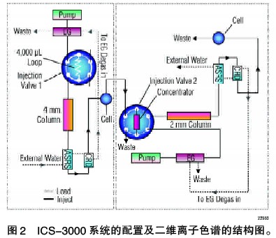 ICS-3000 系統為雙通道二元系統。第一維的進樣閥配備了1 個大體積的定量環(4 mL)。第二維的進樣閥配有1 根富集柱,可以將第一維洗脫下的峰經切割濃縮后送入第二維進行進一步的分析。