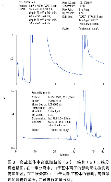 圖2 給出的是可以去除基體并能增強信號的二維IC 示意圖。采用二維系統轉移基體具有幾個優點。首先,可以將樣品大體積進樣到1 根4 mm的色譜柱上。這不僅是因為該色譜柱的柱容量較大,并且對高氯酸鹽具有比對基體更高的選擇性。其次,經第一維分離部分分開的高氯酸鹽可在第二維的富集柱上濃縮。用堿洗脫下來的被抑制的洗脫物為水,可以為離子交換保留和濃縮提供理想的環境。再次,使用比第一維更低的流速進行第二維的分離,從而提高樣品的檢測靈敏度。最后,該方法將兩種不同分離機理整合在一起,可以得到采用任何一維分離模式都得不到的高選擇性。