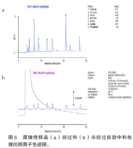 圖5 給出了高濃度堿性樣品中的陰離子經過(a)和未經過(b)中和作用的對比分析結果。對于沒有經過中和作用處理的樣品,陰離子在1%氫氧化鈉溶液中的譜峰寬,靈敏度差。當陰離子在50 %氫氧化鈉溶液中時,基體的背景很高,幾乎檢測不到其他陰離子。圖5-a 顯示的是樣品經過中和作用處理后的結果。可以看出,高背景已經被有效去除,能夠檢測到陰離子,并且樣品的回收率也很高。