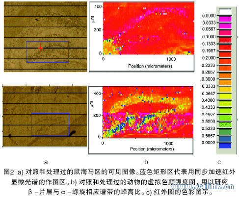 圖2 a 表示了分別給普通飲用水的Tg 鼠和富含鐵的水的Tg 鼠在海馬區的可見圖像,藍色矩形劃出的是紅外切片圖。圖2 b 顯示了掃描區的虛擬色彩紅外圖像,色彩圖示代表的是β - 片層與α - 螺旋蛋白構型分別在1625 和1650 cm-1 的峰高比。飲用富含鐵水的動物表現出由α - 螺旋向β - 折疊構象的轉變,這種轉變可能是由于存在更多的鐵引發的。基于Tg APP2576 鼠的海馬區Aβ蛋白的存在[11]以及近期工作揭示的鐵可誘導Aβ構型轉化為難溶形式(β - 片層),作者認為這些可見的構型變化存在于Aβ蛋白。進一步的研究將在用富含鐵和鋅的水飼養的Tg 模型和正常動物中進行。如果像以前研究揭示的那樣,鋅對Aβ蛋白構象的影響和鐵不同[10,13]。那么,比較用鐵和鋅處理的動物將會是十分有趣的。