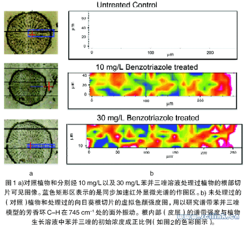 向日葵類植物在濃度低于1 mmol/L 的苯并三唑的水溶液中培養時,吸收和結合了低濃度苯并三唑的向日葵屬植物和未經處理的向日葵的發育情況幾乎一樣。在高濃度溶液中培養后,根部的切片變得非常脆弱,并在顯微鏡下可以觀察到變化。由于苯并三唑的吸收、結合和/ 或生物轉化使根部發生變化的組成包括糖類、纖維素、木質素和蛋白質。這些變化可以用反射吸收顯微光譜來監測。經處理過的根部剖面虛擬色彩強度圖以及在745cm-1 的特征苯并三唑峰的存在顯示了根部組成的變化(圖1)。在745cm-1 處出現的芳香環CH 峰以及在木質素結構中的變化證明了苯并三唑中芳香環沒有被破壞而是與植物體結合。這個例子證明了在植物治理的研究中,紅外顯微光譜可以作為一種研究因在水或土壤中存在有機污染物而導致植物結構變化的工具。