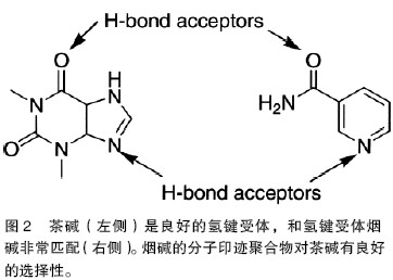 分子間的交叉識別概念引導發展出了ExploraSepTM (MIP T echnologies AB, Lund,Sweden)[14]。這一概念是指以一種分子作為模板合成的分子印跡聚合物,不僅對模板分子有選擇性,對于具有相互作用的官能團、有相似三維空間分布的其他分子也有選擇性。這類似于藥物設計中的藥效團概念,對于分離領域來說,作者稱其為選擇基。例如在發展ExploraSep技術時發現以煙堿為模板的酸性分子聚合物對茶堿也有選擇性。在這一例子中,可以很容易解釋原因。在印跡過程中最強的相互作用基團應是嘧啶環上的氮原子和酰胺鍵上的氧原子。如果將茶堿與煙堿比對,茶堿的氫鍵受體幾乎和煙堿氫鍵受體完全匹配(見圖2)。換句話說,煙堿可以作為茶堿的模板分子類似物。
