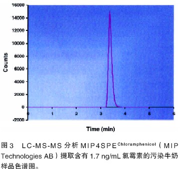 使用ExploraSep 技術,篩選到了幾個選擇基,選定其中一個做進一步研究。雖然它的原始極性模板分子與氯霉素的選擇基很相似,但結構相差很大。為氯霉素合成的分子印跡聚合物的檢測限要低于LC-MS-MS方法最低要求的檢測限(MRPL)(0.3 μg/kg 或0.3 ppb)(見圖3),提高了檢測的可靠性。該方法的效果等同甚至優于免疫檢測方法,并且沒有諸如假陽性或需要特殊處理步驟的缺點。分子印跡聚合物的選擇性可以保證對廣泛的樣品種類例如牛奶、尿樣、蝦和蜂蜜都能達到分析要求。