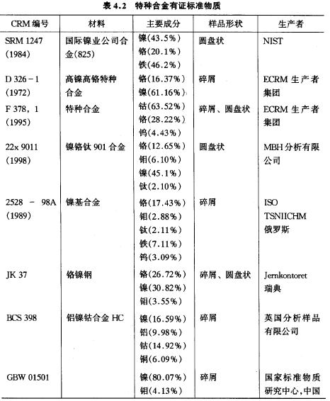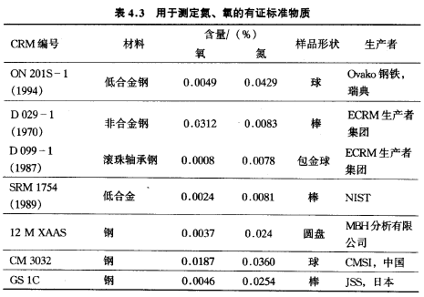 小棒或球狀樣品很適合于做校準用標準物質,因為在測量之前通過化學浸蝕(chemical picking)很容易就可以去除表面的氧化物層。也有一些材料鍍了很薄的一層金(如ECRM 099-1)。這些材料不用任何預處理就可以直接放進氧氣分析器儀的坩堝里,因為它們的表面對氧化作用是惰性的。一些氧和氮測定用的有證標準物質列于表4.3中。 未來的發展