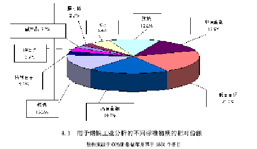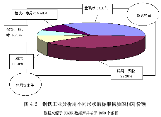 在第7條和第8條中給出的材料中,化合物(如TiO2, SiO2, Al2O3等)的含量和其它的特性,如燒失量或水含量,要定值。圖4.1顯示了在COMAR庫中作為所有鋼鐵分析用標準物質的各個部分,不同類型材料的分布情況。 標準物質的生產者