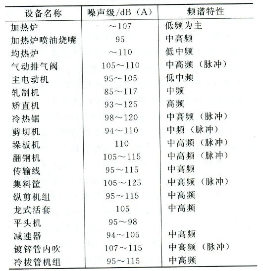 噪聲源 金屬軋制工藝復(fù)雜,在其流程的各個(gè)環(huán)節(jié)如金屬坯料加熱、初軋、成品軋制、精整直到堆垛收集和傳輸轉(zhuǎn)運(yùn)等,都分布有不同類型的噪聲源,其噪聲污染程度一般都比較嚴(yán)重(見表)。主要設(shè)備的A聲級(jí)都超過90dB,有的達(dá)到115dB以上。按照聲源特性區(qū)分,機(jī)械噪聲、空氣動(dòng)力性噪聲、電磁噪聲、燃燒噪聲均有。就一般而言,以機(jī)械性噪聲最為突出。其中尤以各種半成品的鋸切沖剪噪聲,中薄板的傳輸噪聲,鋼管噴吹噪聲,管材的軋制、收集打捆噪聲以及錘鍛噪聲,軌梁的矯直機(jī)噪聲等強(qiáng)度高,影響面大。