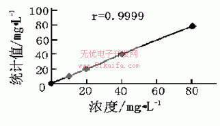 用四氯化碳(CCl4)作溶劑配制標準溶液,濃度范圍為0.0~10.0mg/L。取5個100ml的容量瓶,各加入30ml純化CCl4,然后分別加入0,1,2,4,8ml的濃度為1000mg/L的標準油貯備溶液,分別用純化CCl4稀釋至刻度,上述各瓶中CCl4濃度分別為0,10,20,40,80mg/L,用4cm石英比色皿,經空白調零后,即對標樣進行測定,以吸光度與儀器讀數繪制標準曲線并貯存在儀器中,標準工作曲線如圖2所示: