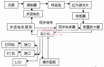 儀器的主要工作原理是:把萃取好的油和溶劑的混合液放入樣品池中。由儀器的紅外光源發出3.4µm的紅外光照射到樣品池的一端,經過溶液從樣品池的另一端出來,紅外光經過溶液時被其中的油吸收一部分,剩余的紅外光照射到專用濾光片上,通過它后由傳感器把光信號變為電信號送入前置放大電路。由單片機控制的微機電路對電信號進行處理計算,最終把對紅外光的吸收轉化為油的濃度[5]。