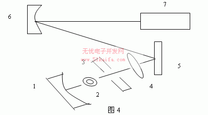 光源結構的設計對整機的性能影響很大。本機的光源系統由光源、穩壓電路、平面反射鏡、球面反射鏡組成。如圖4所示。電源和光源采用穩壓電路,這可保證光輻射強度不受燈絲冷熱態電阻等變化的影響,使光源發光穩定。由光源直接發出的加上由照明光路中球面反射鏡1反射的光輻射通過透鏡4,經由平面反射鏡5、球面反射聚光鏡6會聚到吸收池。這樣可提高光源的利用率。光源采用12伏直流供電,可使用車載蓄電池或儀器專用的蓄電池便攜使用。適于野外操作。