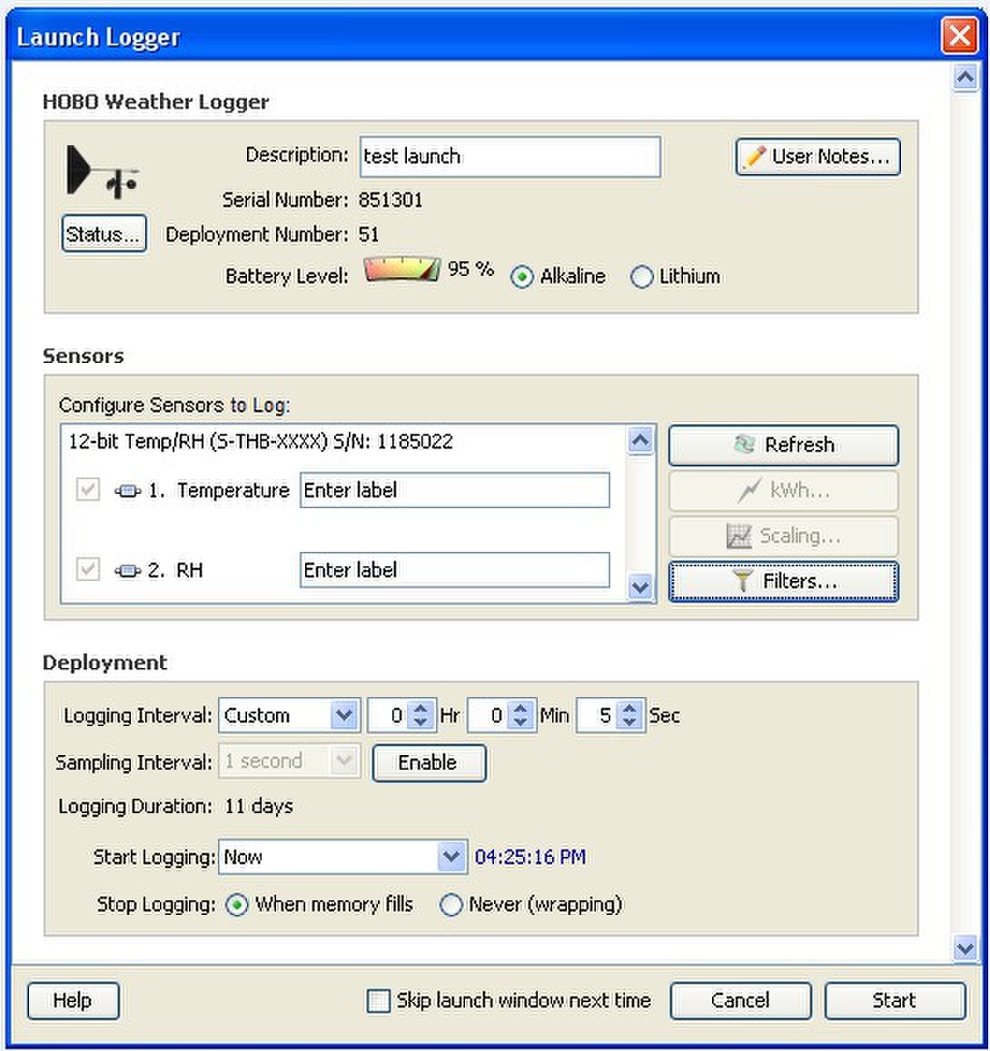 傳感器目前選定的記錄器的記憶。這只是一個理論估計;電池壽命和頻繁工作 和事件日志將影響您的部署。如果你只采伐 狀態變化和事件,沒有估計是可能的。如果您添加或刪除傳感器同時觀看發射窗口,單擊“ 刷新按鈕來獲取更新的 測量時間。