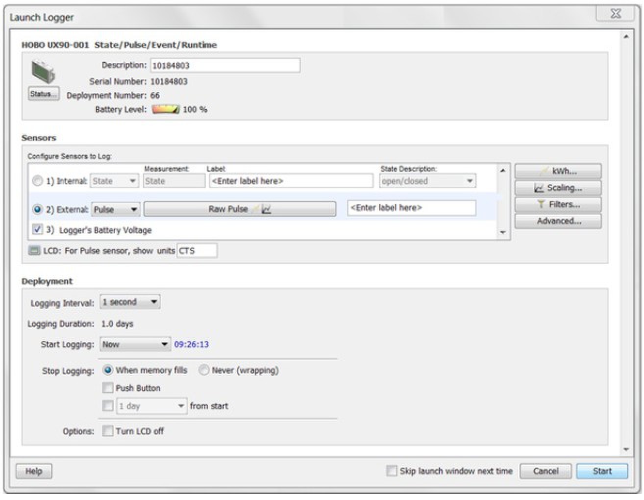 使用hoboware設(shè)置記錄器,包括選擇啟動(dòng)和停止日志記錄選項(xiàng),配置的傳感器,必要時(shí)可以進(jìn)入縮放助手設(shè)置。這可能有助于建立記錄器在某一特定日期/時(shí)間或一個(gè)按鈕啟動(dòng)和連接其它外部設(shè)備和測試連接之前記錄開始。