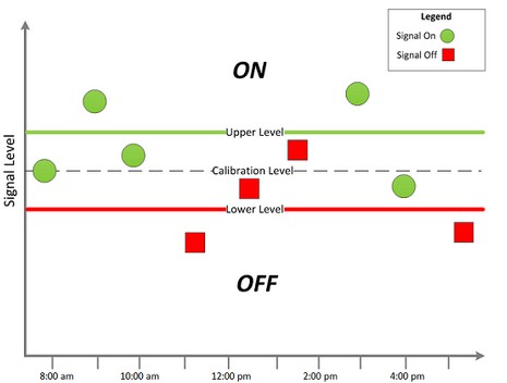 該記錄儀有一個(gè)內(nèi)置的滯后約12.5%的水平,以防止光傳感器或電動(dòng)機(jī)傳感器在ON和OFF時(shí)的信號(hào)電平附近的校準(zhǔn)閾值6.25%之間切換。該圖顯示,記錄儀如何處理滯后。該記錄儀的信號(hào)解釋為ON,直到低于校準(zhǔn)閾值水平較低。一旦切換為關(guān)閉時(shí),該信號(hào)將不會(huì)切換為ON狀態(tài)直到它繞過校準(zhǔn)水平的上限。 注:廣州市駿凱電子科技有限公司是美國ONSET公司HOBO記錄儀大中華區(qū)代理商!HOBO官網(wǎng) :http://www.hobochina.cn/
