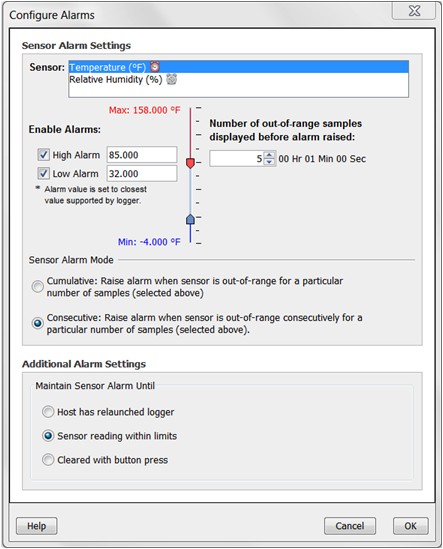 6 UX100系列和UA-001記錄儀只有:選擇累計或連續的傳感器報警模式。 如果選擇累計,則報警將樣品的具體數量(如在上一步中設置)都是限制(高或低的樣品不必是連續的)外后跳閘。 如果選擇連續,則報警將樣品的具體數量(如在上一步中設置)的限制被記錄在一排外面后跳閘。 在上面的例子中,如果有5個讀數是連續高于85°F,則警報將跳閘。 如果我們選擇累計,在5個讀數可以在部署的報警跳閘時發生在任何時間。