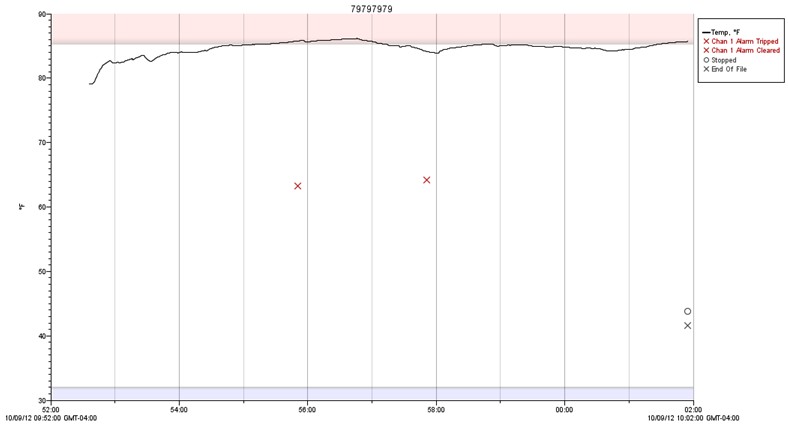 當你讀出記錄儀,高低溫報警值將顯示在圖上。 在下面的例子中,溫度升高到高于85°F等等這些讀數是在紅色,或高報警,劇情部分。 溫度不會低于報警低限,這是劇情的底部的藍色部分。 UX100系列數據采集器也顯示報警事件顯示,當報警被觸發(如果適用的清除)。 在這個例子中,有“查看1報警跳閘”和“查看1報警清除”事件顯示,當溫度報警跳閘和清除。 在“通道1報警清除”事件包含了最遠超出范圍的傳感器之前的報警清除(見分表實際值)的值。