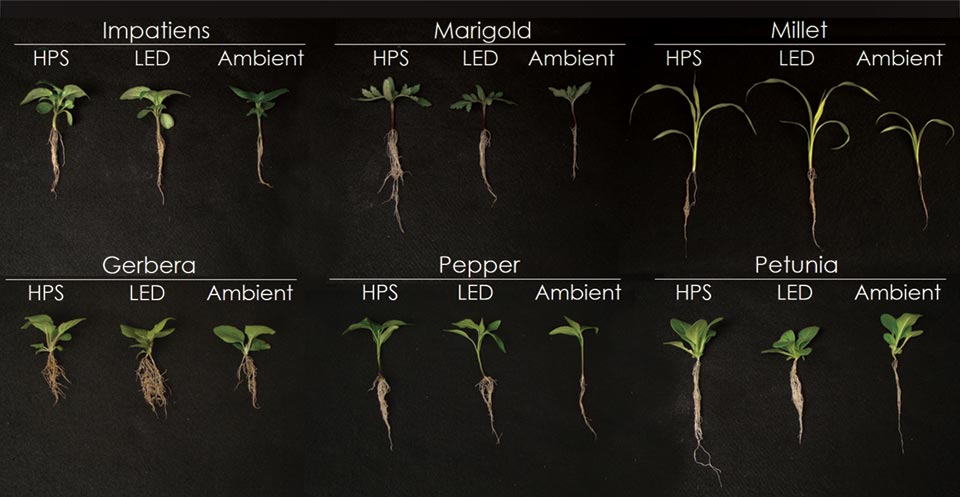 隨著高強度LED陣列的引入,我們的目標是評估LED照明作為替代傳統HPS燈在溫室中的補充照明應用的使用。 具體來說,我們想研究這兩種年輕植物的生產,以及在這兩種補充光源下整理植物材料,以確定對于各種一年生植物種類使用一種植物是否有任何差異或好處。