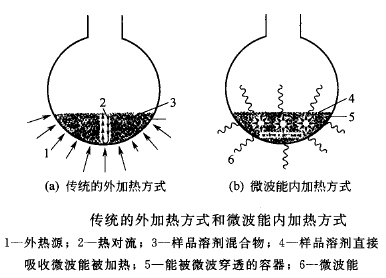 微波加熱不同于一般的常規加熱方式,后者是由外部熱源通過熱輻射由表及里的傳導式加熱,而微波加熱是材料在電磁場中由介質損耗而引起的“體加熱”或“內加熱”(如圖所示)。微波加熱意味著將微波電磁能轉變成為熱能,其能量是通過空間或媒質以電磁波形式來傳遞的,對物質的加熱過程與物質內部分子的極化有著密切的關系。