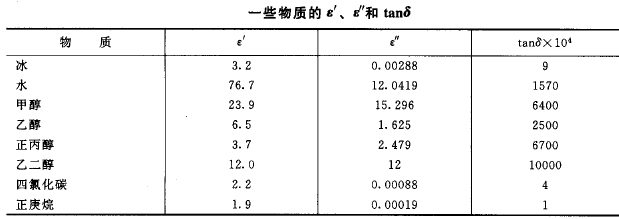 式中,ε′為介電常數,反映電介質吸收微波能力的強弱;ε″為介質損失因子,反映介質耗散微波能的效率。某些溶劑的介電常數較大,但如果它的耗散因子小,在單位時間內吸收微波能多,因而容易出現局部過熱現象。下表列出了一些物質的ε′、ε″和tanδ(3000MHz和