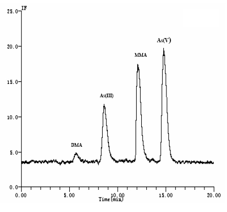 離子色譜與原子熒光聯(lián)用分析砷化合物的條件如下。分離部分包括GS50四元微孔梯度泵(Dionex)和IonPac AS16分析柱(2×250mm)及IonPac AG16保護(hù)柱(2×50mm),以NaOH溶液進(jìn)行梯度淋洗,流速為0.25 mL/min,進(jìn)樣體積為25μL。AF-610D原子熒光光譜儀(北京瑞利分析儀器公司),高強(qiáng)度As空心陰極燈的燈電流為60 mA,負(fù)高壓為270 V,氬氣流速為550 mL/min。原子熒光的蠕動(dòng)泵將10 %(v/v) HCl和4%(m/v)KBH4/0.5%(m/v) KOH溶液泵入,流速分別為2.0 mL/min和2.5 mL/min。150μg/L的四種砷化合物在離子色譜與原子熒光聯(lián)用系統(tǒng)的色譜分離圖如下圖所示。