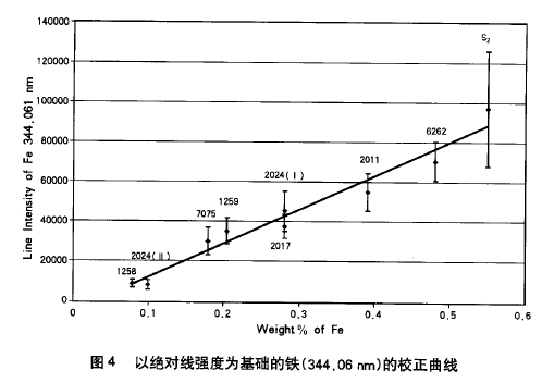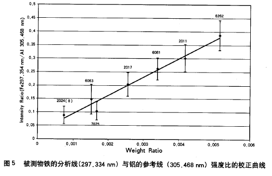 最后經過優化上述實驗參數,使用不同的鋁合金試樣得到校正曲線,其組成見表l。列于表2中的銅、鉻、錳、鐵和鋅的分析線,用于獲得校正曲線。校正曲線的質量分數的線性范圍可高達5%。圖4是鋁合金中鐵元素的典型校正曲線。此外,利用一個元素分析線強度對另一元素的參考分析線強度的比值而得到的校正數據,評述了一種降低實驗偏差影響的校正方法。校正曲線是利用Mg 383.829nm/Fe 388.6282nm、Cr 359.349 nm/Fe 364.7842 nm、Mn 404.136nm/Fe 406,3594 nm、 zn 404.136 nm/Fe344.0606nm以及Fe 297.354nm/Al 305.467nm的強度比值而得到的(圖5是采用該方法得到的典型校正曲線)。校正曲線的線性非常好。這類校正曲線在現場分析試樣的情況下是有用的,因為在現場分析階情況下,實驗條件在實驗過程中有可能會改變。