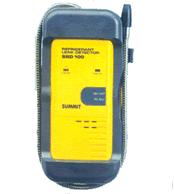 | 致冷氣體泄漏氣體檢測儀SRD100 一、測量范圍: 任何鹵素族氣體測試,其中包括常用制冷劑中的大部分氣體(如CFC, HCFC, HFC) 鹵素復合物(如SF6 ,全氯乙烯及含鹵素的氣體) 注意:國際上使用R代表制冷劑。國內使用F。如R-12代表F-12,R-22代表F-22可將F替換為R 以下列出本儀器可檢測的部分氣體: CFC : R11, R12, 113等 HCFC : R22, R502, R500等 HFC : R134A, R123, R125, R23等 還可檢測其它鹵族化合物如SF6,全氯乙烯及含鹵素的氣體。 二、規格: -.感應器:先進的電離檢測 -.靈敏度:0.4 OZ/年(11.34克/年)134A依據LS-20泄漏標準 -.指示器:聽覺:可調“滴嗒”速率 視覺:閃爍“LED” -.響應時間:瞬時 -.工作周期:連續 -.預熱時間:10秒 -.電源:1枚9V電池 -.電池壽命:16小時 -.尺寸(英寸):7 1/4”(H)×3 1/4”(W)×1 3/8”(D) -.探頭長度(英寸):18” -.重量:504g 三、操作步驟: 1.在無污染環境下將儀表旋鈕打到“ON”位置 2.儀表開機后綠色電源燈將點亮,如果電量不足,紅色低電池指示燈將亮起且“嘀嗒”速率將不可調。 3.用轉輪調到一個低的“嘀嗒”速率,紅色泄露指示燈將隨“嘀嗒”速率的快慢閃爍。 4.要定位發生泄露的地點,將探頭嘴沿泄漏區進行檢查,當您越接近泄漏點“嘀嗒”速率聲將會越快。為更容易辨清泄漏源可以將“嘀嗒”速率調慢一點。當您遠離泄漏源市“嘀嗒”速率將會減慢。 5.在嘈雜環境中測量時,可以監視紅色泄漏指示燈,當“嘀嗒”速率變快時,指示燈閃動頻率也越快。 6.如果“嘀嗒”速率變得不可控制,可能需要更換探頭過濾器或探頭本身。探頭過濾器可以卸下并可用酒精和壓縮空氣清洗 7.建議每年更換一次探頭。 四、更換探頭過濾器及更換探頭 要更換探頭過濾器,將探頭的黑色嘴從蛇皮管組件上拉出。 要更換探頭請按以下步驟 1.將儀表關機 2.將探頭逆時針擰下 3.更換新探頭后順時針擰緊 注: 更換或清潔探頭前請將儀表關機,否則可能會有輕微觸電感。 |