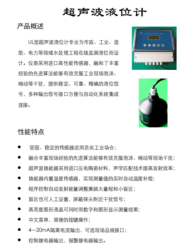 JKUL系列超聲波液位計(jì)專業(yè)為市政、工業(yè)、造紙、電力等領(lǐng)域水處理工程在線監(jiān)測(cè)液位而設(shè)計(jì)。儀表采用進(jìn)口高性能傳感器,融合了豐富經(jīng)驗(yàn)的先進(jìn)算法能夠有效克服工業(yè)現(xiàn)場(chǎng)泡沫、喘動(dòng)等干擾,提供穩(wěn)定、可靠、精確的液位信號(hào),多種輸出信號(hào)接口方便與自動(dòng)化系統(tǒng)集成連接。 |