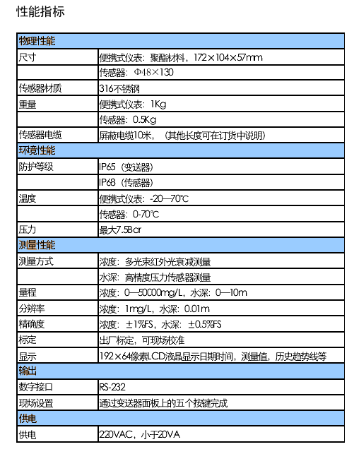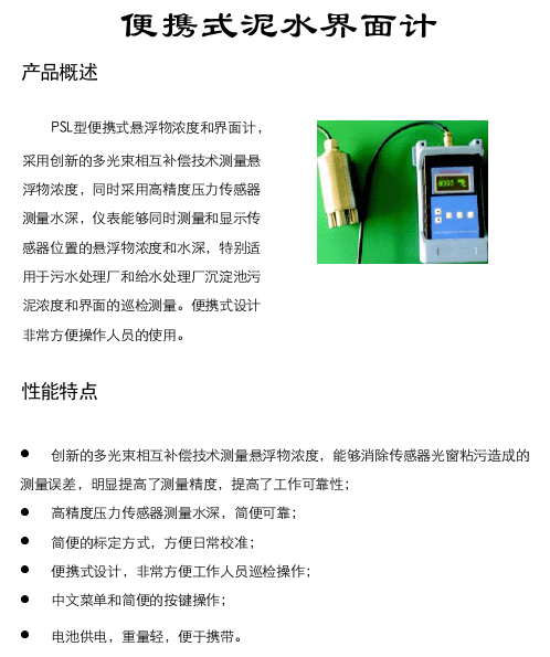 JKPSL型便攜式懸浮物濃度和界面計,采用創(chuàng)新的多光束相互補償技術測量懸浮物濃度,同時采用高精度壓力傳感器測量水深,儀表能夠同時測量和顯示傳感器位置的懸浮物濃度和水深,特別適合于污水處理廠和給水廠沉淀池污泥濃度和界面的巡檢測量。