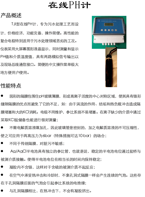 JKTJL型在線PH計,專為污水處理工藝而設計,價格經濟,功能完備,操作簡便。高性能的復合電極特別適用于污水處理領域惡劣的工況。儀表采用大屏幕圖形液晶顯示,同時測量和顯示PH值和介質溫度值,具有兩路模擬信號輸出以及現場總線通信接口。