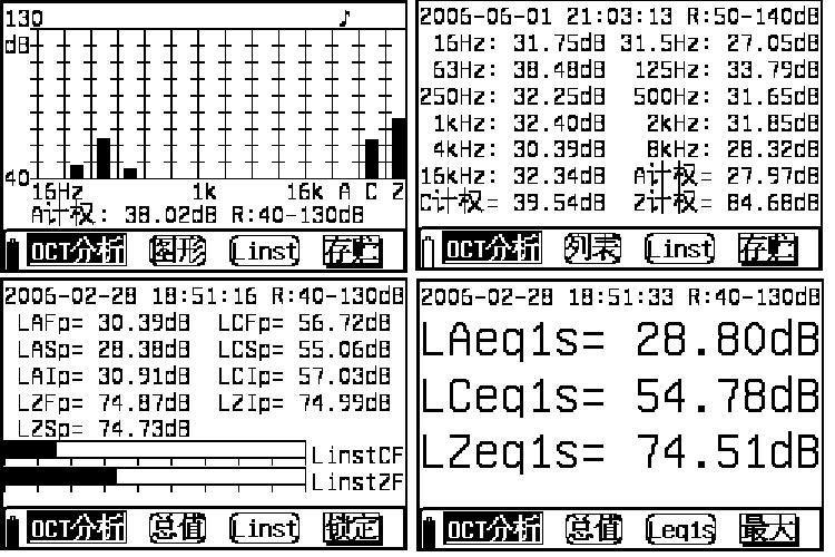 9)        主要測量界面:列表界面、圖形界面。列表界面和圖形界面可以同時顯示11個中心頻率的頻帶聲級壓以及A、C和Z計權聲壓級。