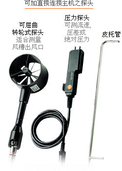 • 風速測量 - 例如用轉輪探頭,熱敏探頭,皮托管;加上15個可以用于各個方面的附加探頭。