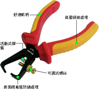PM-910, VDE 1000V 頂切剝線鉗(160mm) [電工剪鉗類] 特點(diǎn):. 通過德國VDE和GS品質(zhì)認(rèn)證,符合IEC 60900耐高壓1000V 安全規(guī)范。. 人體工學(xué)雙色手柄,膠柄采用耐高壓、耐燃材質(zhì)制造。. 本體采用鉻釩鋼打造,刀口經(jīng)硬化處理,表面鐡氟龍防銹處理。