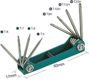 8PK-021T, 折疊型星型扳手組(8支組)T5~T20 [六角扳手類]. 規格:T5,T6,T7,T8,T9H,T10H,T15H,T20H. 材質:SAE6150 鉻釩鋼. 本體鍍鎳處理