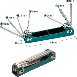 8PK-021S, 折疊型綜合扳手組(7支組)公制六 [六角扳手類]. 規格: 2,2.5,3,4,5,mm 5mm #2. 材質: SAE6150鉻釩鋼. 本體鍍鎳處理