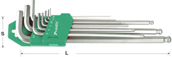 HW-129BL, 長臂球型扳手組(9支組) [六角扳手類]. 1.5,2,2.5,3,4,5,6,8,10mm (公制). 材質: SAE6150 鉻釩鋼. 特長型. 表面霧鉻處理 規格(mm) 短(mm) 長(mm) 1.5 14 90 2 16 100 2.5 18 112 3 20 126 4 25 140 5 28 160 6 32 180 8 36 200 10 40 224 重量 (g) 包裝方式 415±10 泡殼卡片
