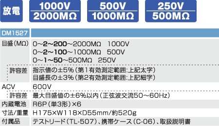 | 本器は定格電圧1000V、500V、250Vの印加電圧3レンジ式の絶縁抵抗計です。パワーオンとパワーロックが可能な2段式プッシュスイッチを採用。測定後、充電された電圧を放電するディスチャージ機能付きです。內蔵電池の電池容量が簡単に測れるインナーバッテリチェック機能を搭載しました。 ● 耐衝撃デザイン ● 充電された電圧を放電するディスチャージ機能 ● パワーオンとパワーロックが可能な2段式プッシュスイッチ ● パワーオンがLEDで確認できる高圧発生インジケータ ● インナーバッテリチェック機能 ● 活線狀況を見極められる交流電圧測定機能 ● 印加電圧3レンジ切換式 |