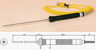 分度號:K、E、J 導(dǎo)線長度:2000㎜ 手柄材質(zhì):電木 使用溫度范圍: -50℃ ~ 600℃ 應(yīng)用:適用于高溫靜止表面。 |