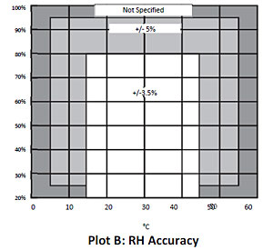 范圍: 15%〜95%精度: ±3.5%,從25%到85%的范圍內為15°至45°C(59°至113°F) ,包括滯后;±5%,從25%到95%,比5°至 55°C(41°至131°F)包括遲滯,Plot B(B圖)